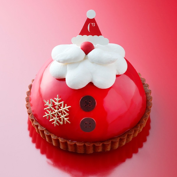 シーキューブのクリスマス限定ケーキ。まろやかな甘さのマスカルポーネムースと甘酸っぱいベリーを合わせました。イチゴ味の真っ赤なグラサージュとシャンティクリームの髭でサンタクロースをデザインしました。
