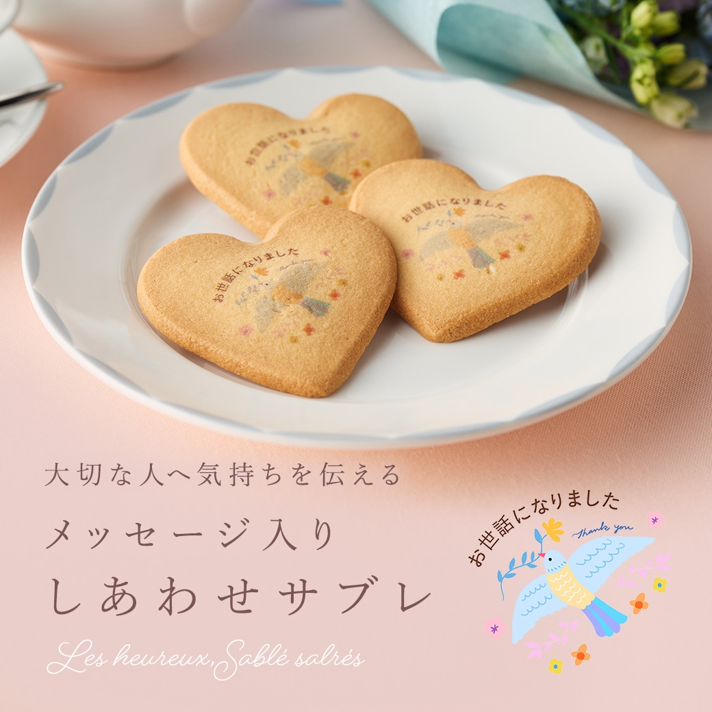 贈る人贈られた人、どちらも幸せな気持ちになるハートのサブレ。友人や職場などへのちょっとしたお礼に幅広くご利用いただける、心に寄り添うスペシャルメッセージ入り「しあわせサブレ」です。