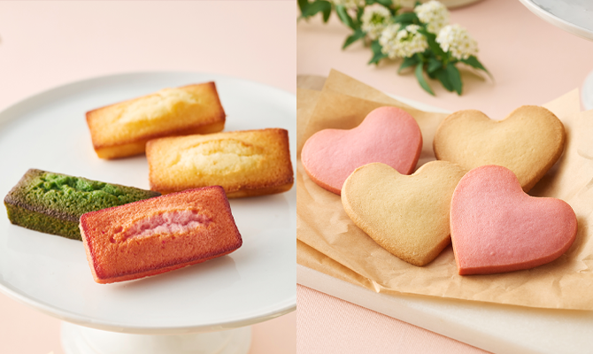 アーモンドの香ばしさがふんわりと香る季節限定「いちごフィナンシェ」と定番人気の「フィナンシェ」、"コクの深い余韻"を意識した抹茶「さみどり」を使用した「錦抹茶フィナンシェ」、ハートの形がほほえみを呼ぶさっくりとした食感の「しあわせサブレ」、いちごのピューレを使った「しあわせサブレいちご」を詰め合わせました。