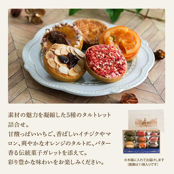 | 内容量 | 【11個入り】タルト・フレーズ×1、ガレット・ブルトンヌ×1、タルト・オランジェ×1、サブレ・マカダム×2、サブレ・ノワゼット×2、マドレーヌ・テヴェール×2、マドレーヌ・フランボワーズ×2 |