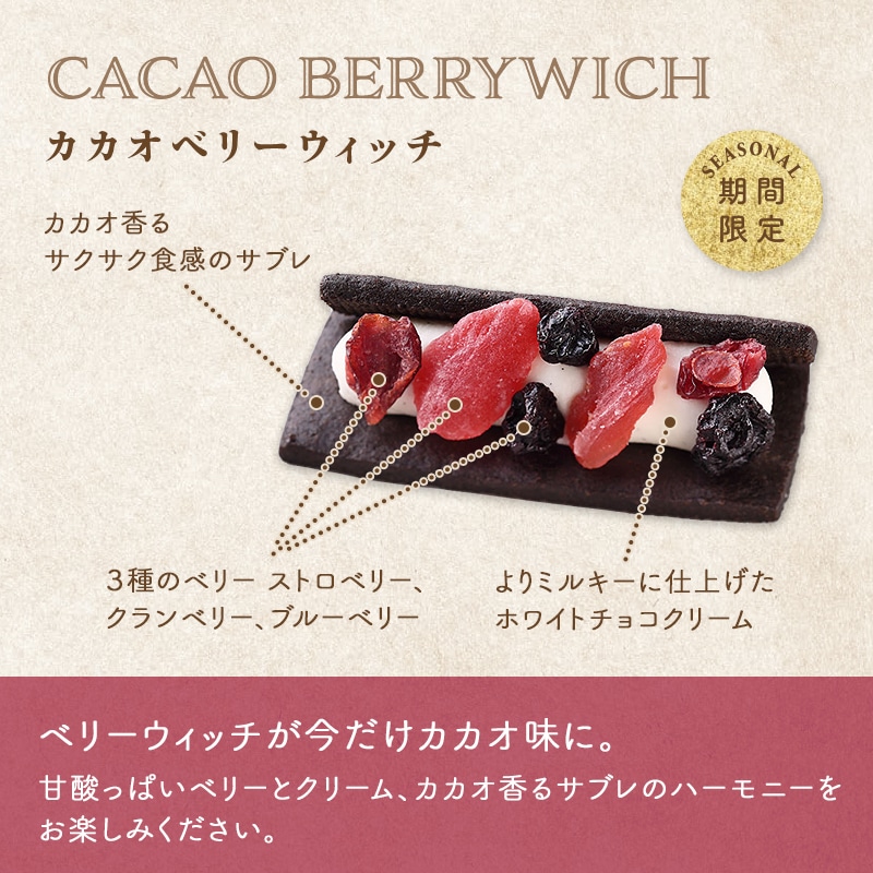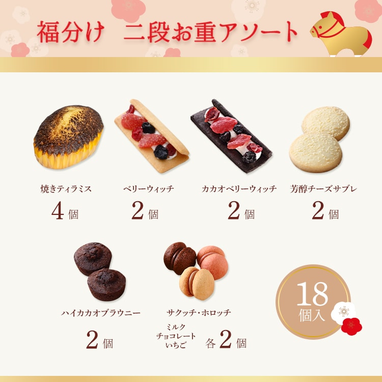 | 内容量 | 【焼きティラミス】4個 【ベリーウィッチ】2個【カカオベリーウィッチ】2個 【サクッチ・ホロッチ】いちご・ミルク・チョコ〈各2個〉 【ハイカカオブラウニー】2個 【芳醇チーズサブレ】2個 全18個 |