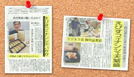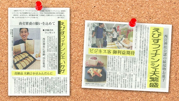 えびすフィナンシェは十日えびすの「開門神事・福男選び」で有名な「西宮神社」にて「奉納菓子」として毎月1日の旬祭に奉納しています。えびすさまの福にあやかった縁起の良いお菓子は福男の副賞にも贈られており、お取引先様や、 ご友人、ご家族への贈り物にピッタリです。