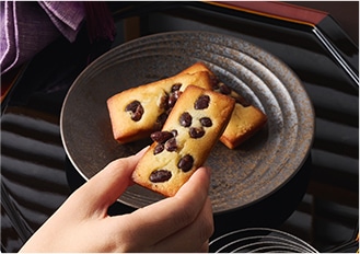 縁起物「大納言小豆」をのせて焼き上げた贅沢な逸品。