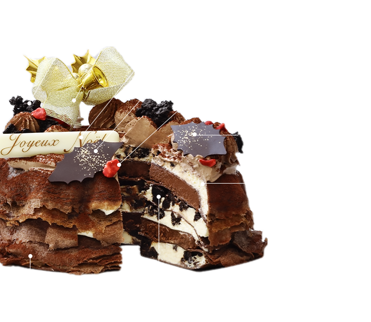 層を重ねた薄いクレープ生地の間には、濃厚なチョコムースと、アマレットの香りが引き立つチェリーとクリームが絶妙に絡み合い、一口ごとに魅惑的な味わいを楽しめます。