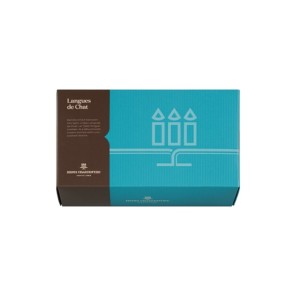 ラング・ド・シャ(猫の舌)と呼ばれるクッキーをご存知ですか。これは、よく泡立てた卵白を加えて焼き上げた、猫の舌のように薄くかろやかなクッキーのこと。そこに香り高いラムレーズン入りのクリームをサンドしました。クッキーは、プレーンとチョコレートの2種類。サクッとした食感とともに、クリームの豊かなコクが広がります。