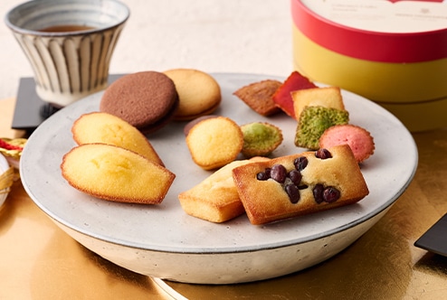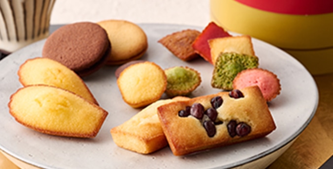 定番人気の「フィナンシェ」と「マドレーヌ」、サクッとかろやかな「ラング・ド・シャ」、8種の色とりどりの焼き菓子「プティ・ガトー・アソルティ」を詰め合わせました。