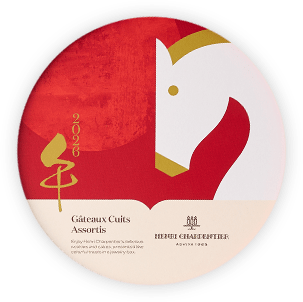 紅白×ゴールドのおめでたいカラーを使用した丸箱へ、