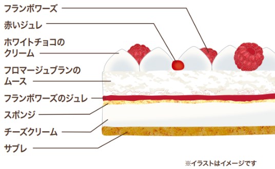 フランスで研修を経験したシェフが、現地で得た知識と技術を活かしたケーキです。フランボワーズの鮮やかな赤色とレアチーズの白色が、美しいコントラストとなるようにデザインしました。